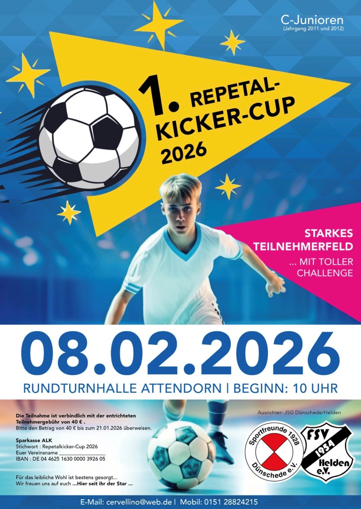 Am Sonntag, den 08.02.2026, findet in der Rundturnhalle Attendorn die Premiere des 1. Repetal-Kicker-Cups 2026 für C-Junioren Mannschaften statt. Ausrichter des hochklassig besetzten Jugendturniers ist die JSG Dünschede/Helden, die alle teilnehmenden Mannschaften, Zuschauer und Fußballfreunde recht herzlich willkommen heißt. Der Turnierstart ist für 09:30 Uhr angesetzt.